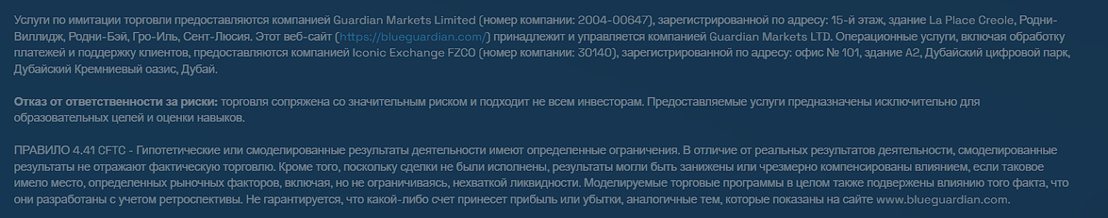 В футере сайта указано, что компания Guardian Markets LTD зарегистрирована в Британии и Дубаи. Указан номер лицензии DFSA. Однако скринов самих документов разработчики не предоставляют.