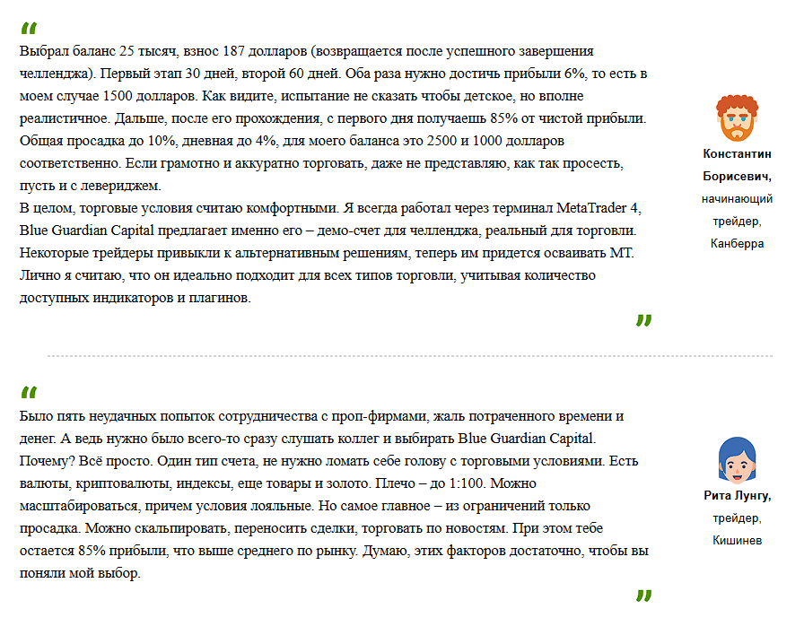 Те, кто прошли отбор, могут торговать реальными средствами компании «Блю Гуардиан» с кредитным плечом 1:50 и неограниченным процентом дохода. Можно получить средства компании от 10 000 до 100 000 долларов. Для трейдеров с выдающимися результатами могут увеличить этот порог до 1,8 миллионов долларов.На blueguardian.com обещают, что трейдеры будут получать процент от прибыли – от 85 до 90%. Деньги выводят на банковский счёт или карты раз в 2 недели. Вычитают также комиссию за сделки 3,5%. Торговать можно классическими активами: крипта, фиаты, металлы, акции и индексы.