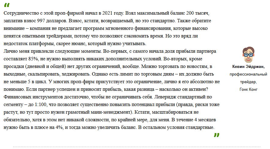 На сайте tradersunion.com есть 3 положительных отзывах. Условия кажутся пользователям комфортными, взносы небольшими. Клиенты говорят, что можно использовать любые торговые стратегии. Ограничения касаются только потерь от сделок.
