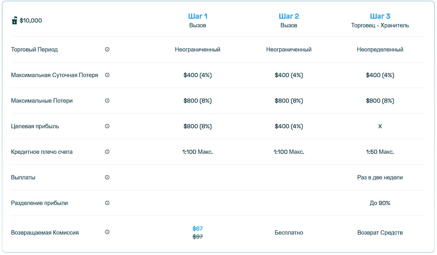 Второй этап длится до 80 дня торговли. Целевая прибыль на нём составляет 4%. Трейдерам предоставляется торговля с кредитным плечом 1:100 в тестовом периоде. Все сделки являются виртуальными и не предполагают использование реальных средств. Однако за прохождение первого этапа отбора придётся заплатить от 67 до 697 долларов. Сумма будет зависеть от того, на какое финансирование рассчитывает трейдер.