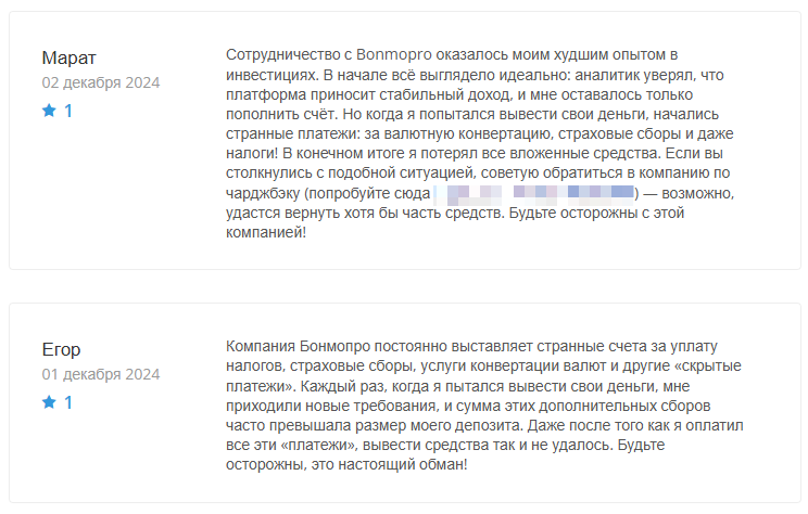 В частности есть сообщения о том, что граждане испытывают проблемы с выводом средств с сайта. Сообщается о схеме, в которой инвестору предлагается оплатить не оговоренные ранее комиссии и платежи. Они способны нанести существенный урон по финансам. Отзывы о Bonmopro Com показывают то, что есть реальные пострадавшие от обмана со стороны конторы.