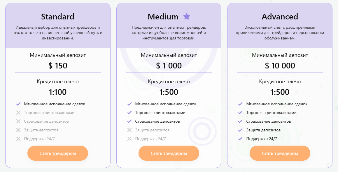 Условия обслуживания определяются тем, сколько денег лежит на балансе депозита у клиента. Так если на счету у него окажется немногим более 150-ти долларов на внутреннем кошельке сайта, то для него будет доступно только мгновенное исполнение сделок, а кредитное плечо составит 1:100. Чем больше пополнить счет, тем больше преимуществ в обслуживании будет иметь инвестор. Своим клиентам Bonmopro может дать торговать криптовалютой, обеспечить страхование депозитов и доступ к круглосуточной техподдержке и многое другое.