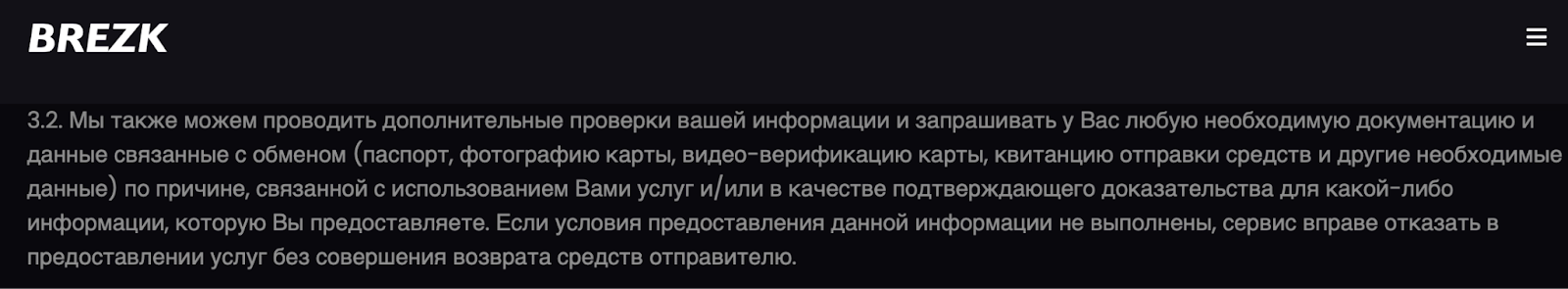 В соглашении на сайте указывается, что обменник имеет право запрашивать дополнительную информацию о личности пользователя и личных данных, а в случае отказа Brezk com предоставить сведения сделку отменят и возврата средств не будет.