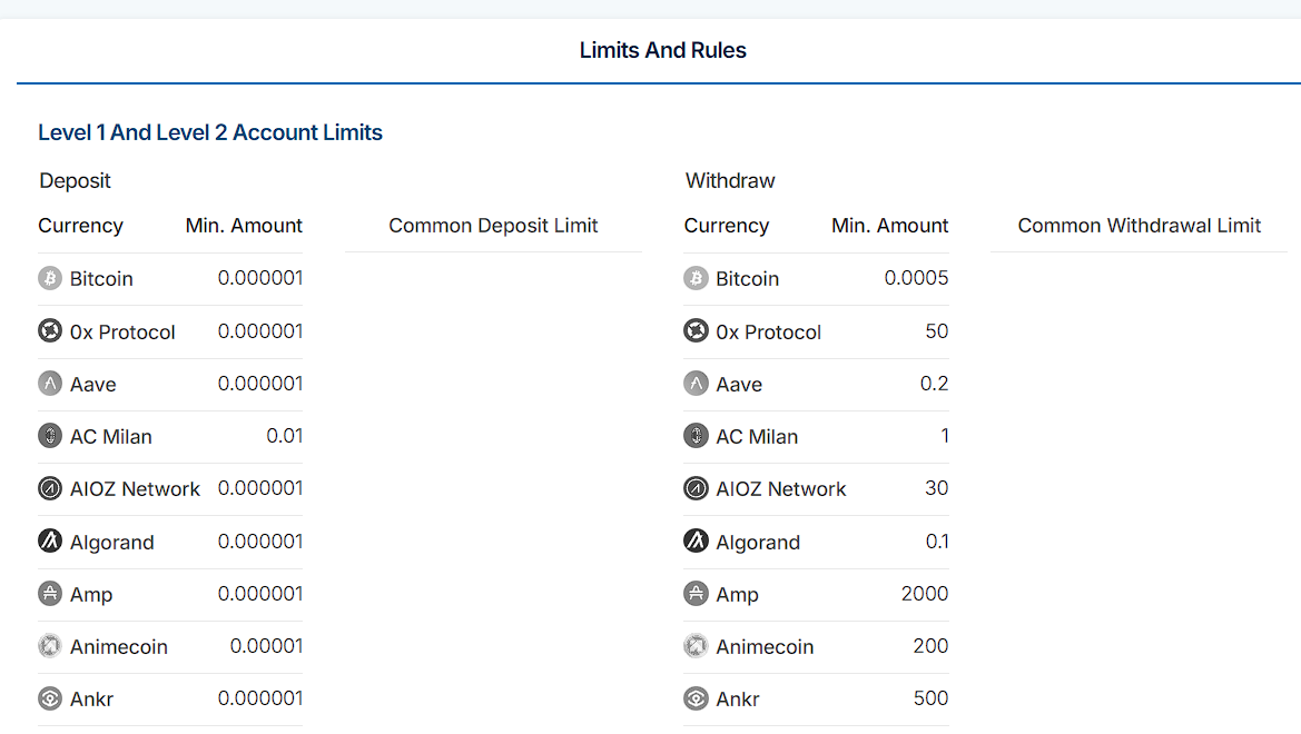Для торговли предлагают два варианта терминала: базовый и профессиональный. Первый подойдёт новичкам, так как на нём минимальное количество функций и настроек. Опытным пользователям предлагают расширенную аналитику и графики с популярными ордерами: трейлинг-стоп, рыночный, стоп-лосс и т.д. Есть также возможность скачать приложение в App Store и торговать через мобильный телефон.После регистрации средства пользователя хранятся на холодном кошельке. Особых тарифов нет – любой клиент может начать торговать с минимальных вложений. Лимиты зависят от выбранной крипты. Например, для Биткоина можно минимально внести 0,000001 BCT, а вывести от 0,0005 BTC. Это около 1 и 48 долларов, соответственно.