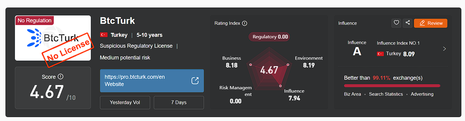 По заявлениям на сайте, компания «Битиси Тюрк Про» работает на финансовом рынке с 2013 года. Таким словам верить не стоит, так как подтверждений нет. Представители заявляют, что организация зарегистрирована в Торговой палате Стамбула и обладает капиталом в 100 000 000 турецких лир. Также известно, что Btcturk располагается в башне «Империя», но о правдивости таких слов мы ничего не можем сказать. Информация на сайте брокера не подтверждается официальными документами.