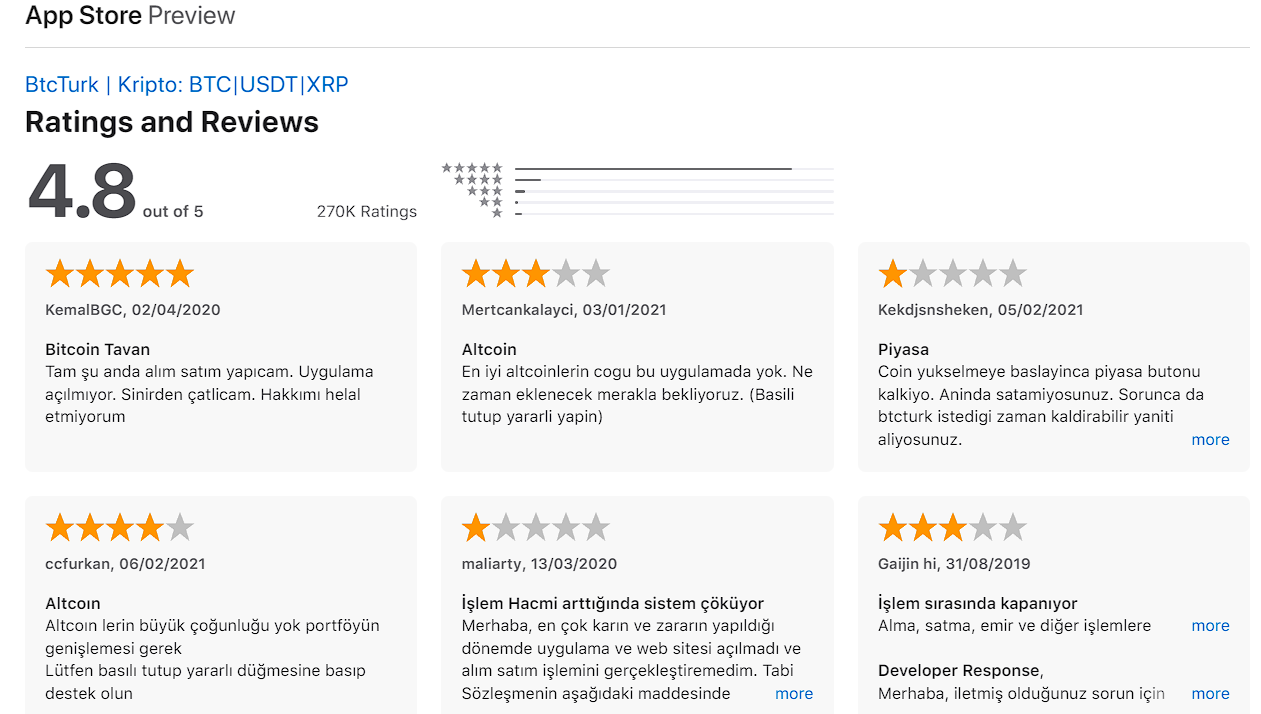 На apps.apple.com можно посмотреть рейтинг приложения Btcturk. Сегодня он составляет 4,8 из 5, что является высоким показателем. Большинство пользователей хвалят комфорт и большой выбор крипты. Есть и те, кому не нравятся высокие комиссии, о которых можно узнать лишь в личном кабинете. Клиенты часто замечают, что приложение даёт сбои.