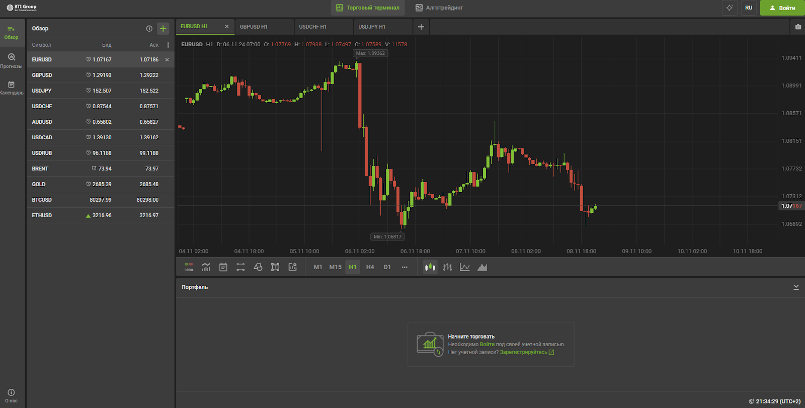 Трейдинговый терминал расположен на поддомене другого сайта Webtrader groupbti com. На нем имеются такие функции, как обзоры, прогнозы и календарь, а также алготрейдинг.