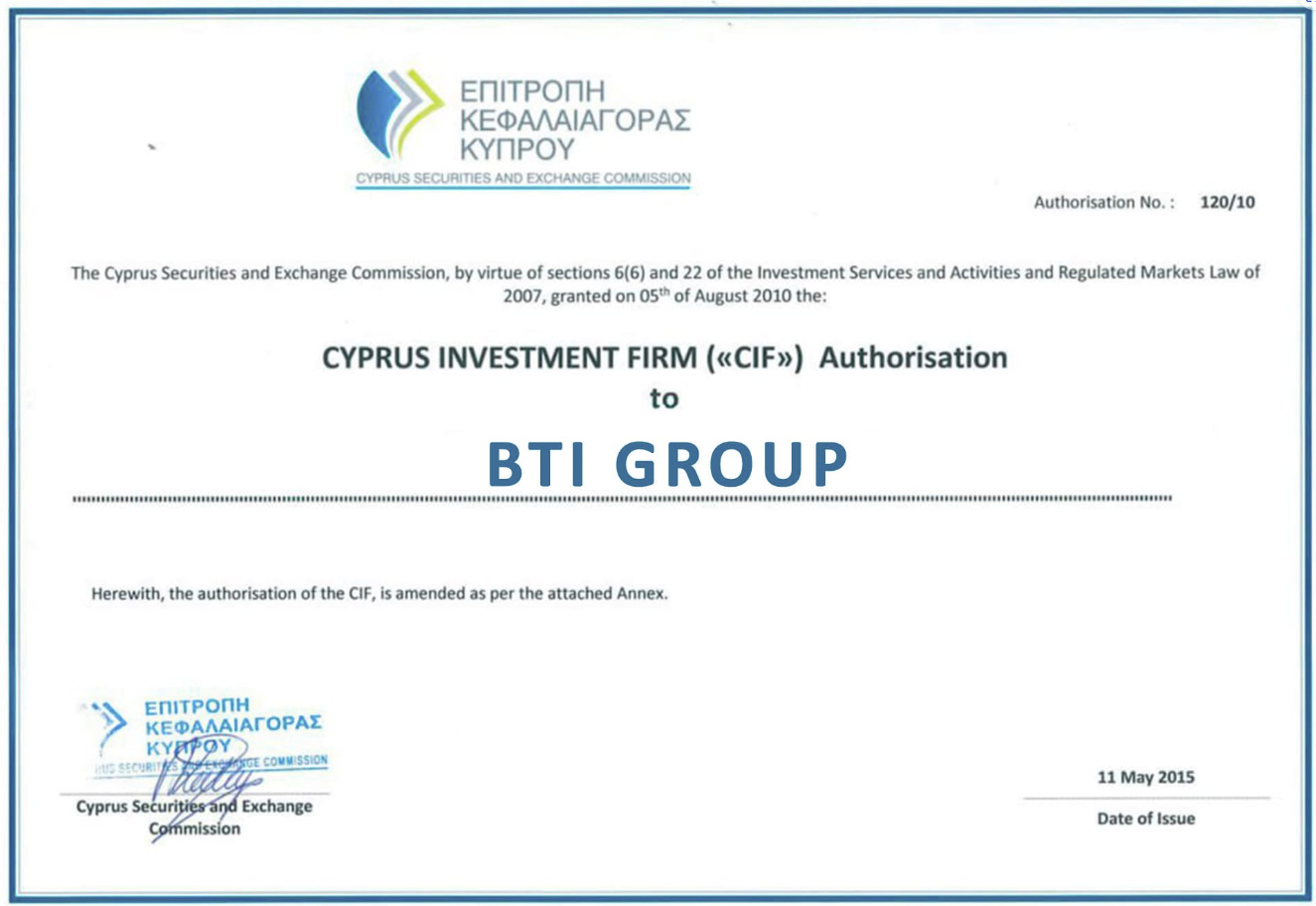 Известно, что брокер BTI Group зарегистрирован в Германии. Он имеет лицензию кипрского регулятора CySEC, выданную в мае 2015 года.
