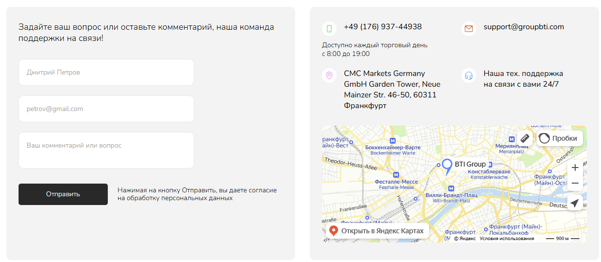В качестве контактной информации сообщается об адресе офиса во Франкфурте, Германия. На сайте представлен номер телефона, e-mail, а также форма обратной связи. О страницах в социальных сетях ничего не сказано.