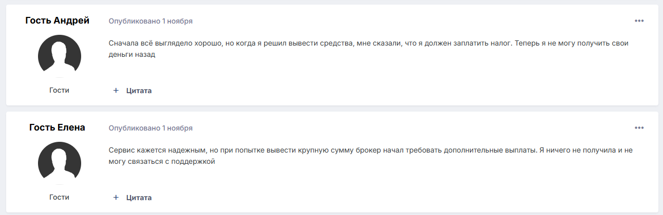 В интернете нашлись заявления обманутых клиентов о том, что организация требует выплат дополнительных комиссий. В итоге, блокирует депозит и не возвращает средства.