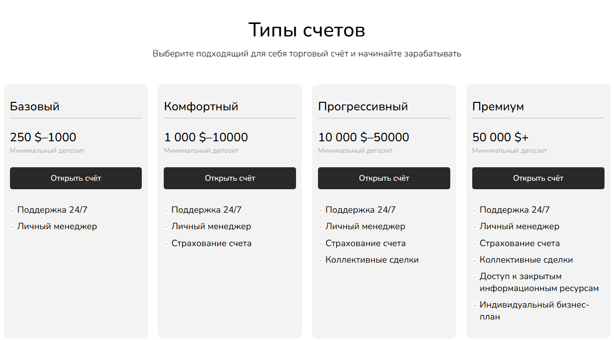 Для доступа к терминалу потребуется регистрация аккаунта и пополнение баланса платежного кошелька. Есть несколько типов счетов, например, “Базовый” с минимальным депозитом от 250 долларов. Информация о тарифах представлена на скриншоте выше.