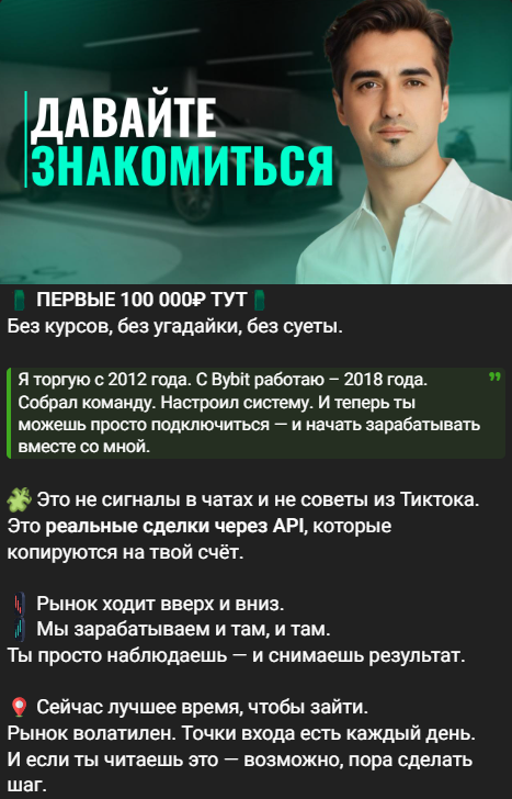 В закреплённых единственный пост – предложение присоединиться к команде автора и начать зарабатывать деньги. Админ уточняет, что это не сигналы в чатах и не советы из ТикТока, а реальные сделки API, копируемые клиентами на собственный счёт. Как утверждает трейдер, точки входа есть на каждый день. За подробностями опять-таки – только в личные сообщения.