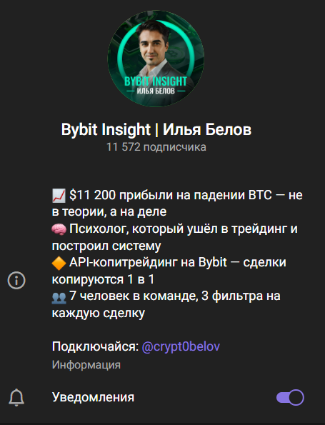 - условия сотрудничества с «Bybit Insight | Илья Белов» скрыты – самостоятельно, без связи с трейдером, проанализировать все перспективы и риски не получится;