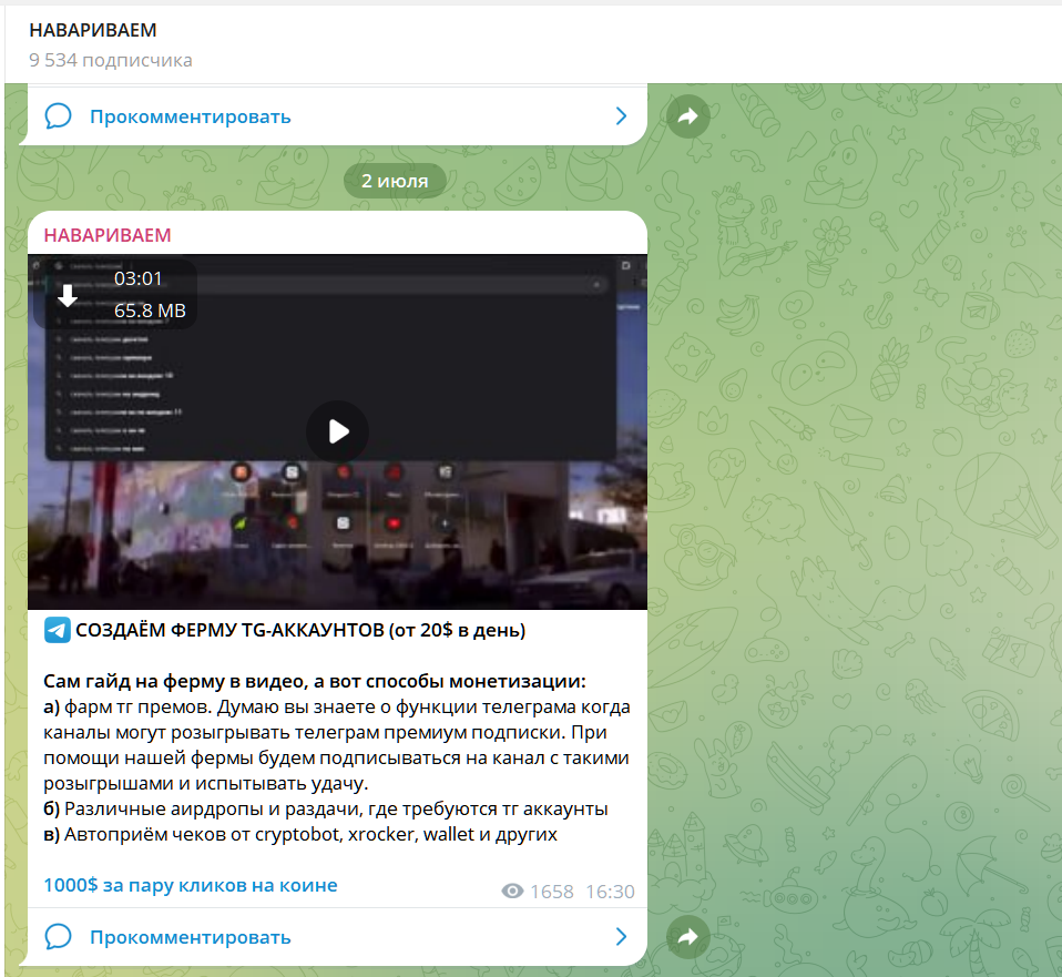 На втором канале продолжают рекламировать неликвидные мем коины, продвигать сомнительные схемы заработка на разных методах обмана крупных маркетплейсов, сервисов доставки.