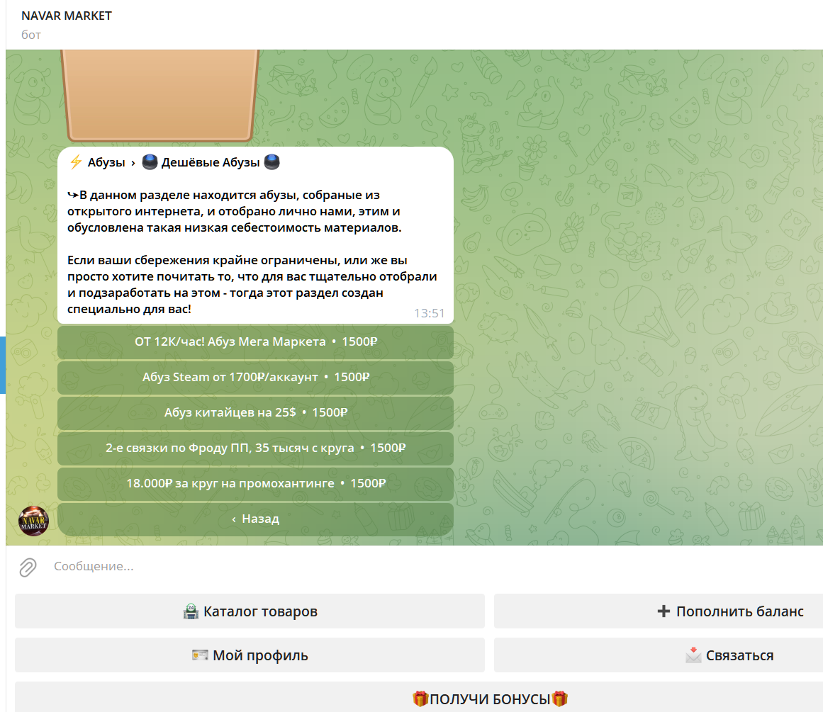 Самый популярный способ залива схемным трафиком это так называемые «сигнальные боты». На один из таких ботов Navar Market, который до сих пор успешно работает в ТГ, трейдер активно призывает подписываться всех желающих.