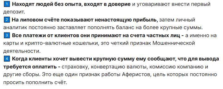 Другой пользователь объясняет схему обмана у этого «брокера»: людей уговаривают внести первый депозит, затем показывают ненастоящую прибыль на сайте и убеждают положить еще больше денег. Все платежи идут на карты частных лиц. Если клиент хочет вывести деньги, его просят сначала оплатить страховку, комиссию, и так далее. Получить свои средства в итоге невозможно.