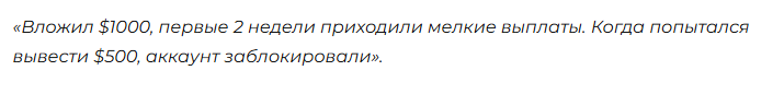 Один из инвесторов отмечает, что вложил $1000 в проект. Сначала он получал мелкие выплаты, но после попытки забрать $500 аккаунт был заблокирован.