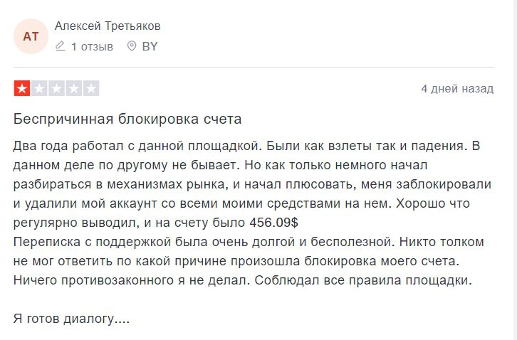 - даже если у пользователя выходит на торгах получать стабильный заработок, то вскоре сайт просто заблокирует доступ к платформе, не сообщив причину такого поступка;