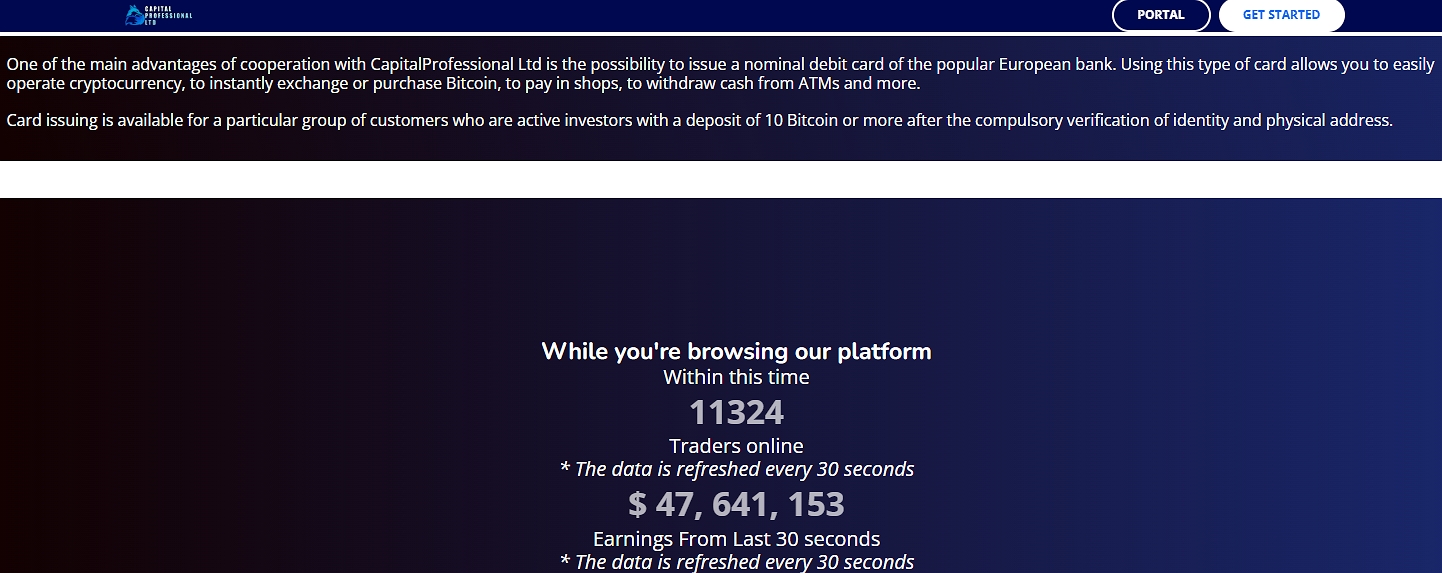 Ресурс конторы создает впечатление безжизненного, притом создатели Capital Professional Ltd приводят явно нереалистичную цифру прибыли 11 300 трейдеров. За полминуты те якобы поднимают $47,640,000, и даже клиенты Binance вряд ли помышляют о подобном «клондайке».