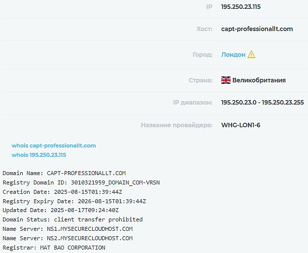 Контора Capital Professional Limited якобы основана 30.03.2011 и получила лицензию в Англии, но это не так. Ресурс Capt Professionallt com запущен 15.08.2025, то есть на момент анализа работает пару недель.