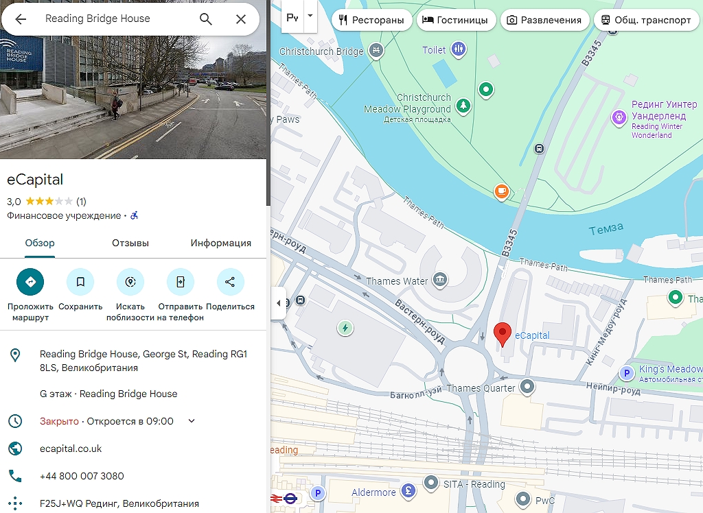 На это намекает подложный адрес организации, не поддающийся верификации по картам. Для локации Ground Floor Reading Bridge House, George Street, Reading, RG1 8LS нет упоминаний о Capital Professional Ltd, но есть отметка о некой eCapital.