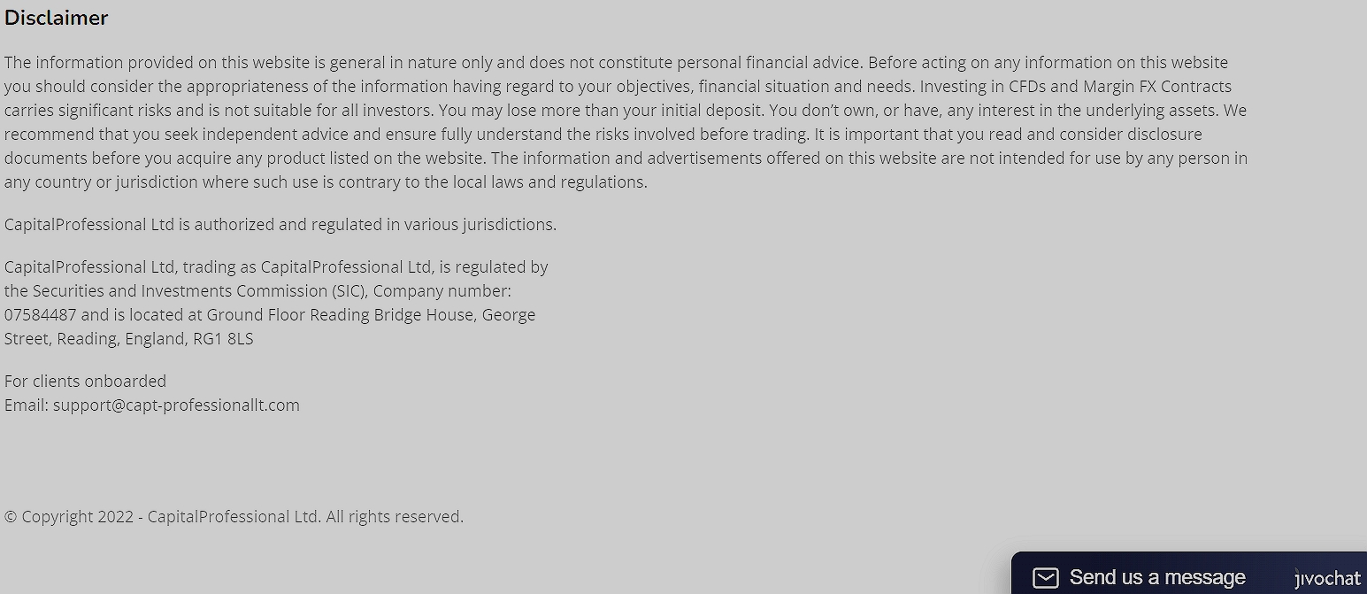 Адекватных способов связи брокер не предлагает — Capital Professional Limited ограничился Live-чатом и e-mail support@capt professionallt com. У техподдержки CapitalProfessional Ltd нет ни канала в Телеграмм, ни аккаунтов в соцсетях, потому при внесении и выводе депозитов есть риск столкнуться с мошенничеством.
