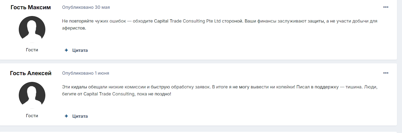 Мы провели обзор брокера и выяснили, что в июне 2025 года сайты проекта не работают, доказательств регулирования деятельности нет, а некоторые пользователи иногда пишут в отзывах о Capital Trade Consulting Pte Ltd, что потеряли средства.