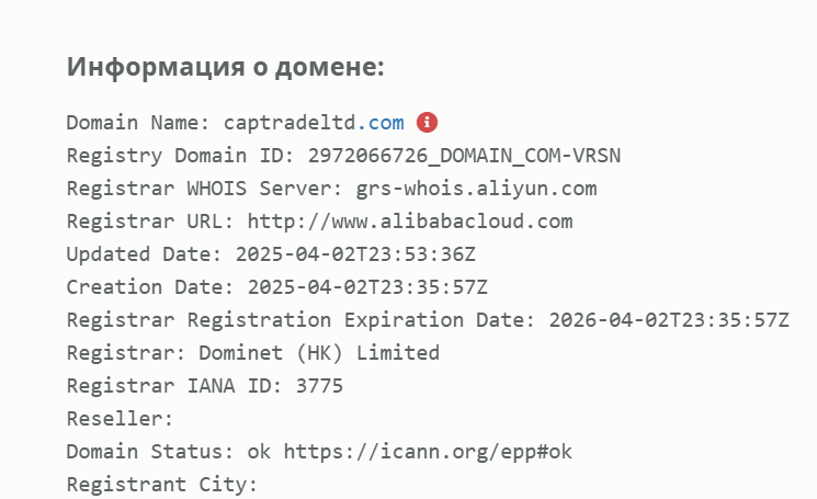 Известно про два сайта, на которых площадка вела деятельность в зоне .com с именами CapTrdLtd и CapTradeLtd, но оба ресурса в конце июня 2025 года недоступны. На сторонних источниках утверждают, что брокер работает более 20 лет, что выглядит странно, поэтому мы решили проверить домены Capital Trade Consulting через сервис WebNames. Оказалось, что регистрация первого прошла в апреле 2025 года, второго – в мае, значит, это очень молодой проект.