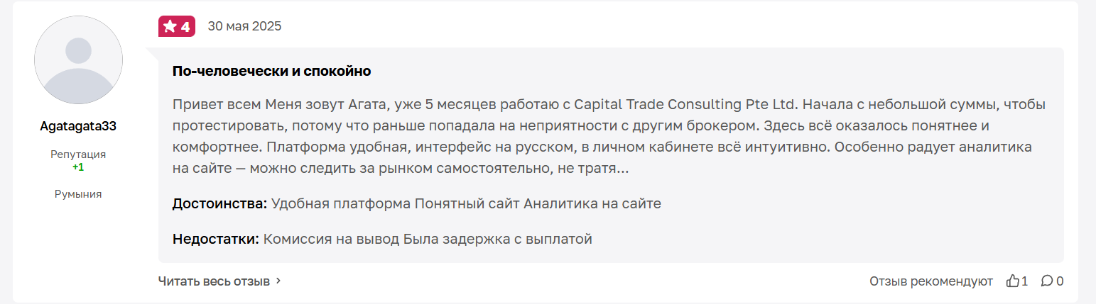 Положительных отзывов о Capital Trade Consulting Pte Ltd достаточно много, хотя все равно они доверия не вызывают, так как написаны только в мае 2025 года. Если брокер работает с 2001, должны быть хоть какие-то упоминания о нем за все это время, но ничего нет, а отрицательные отзывы тоже присутствуют, хотя их гораздо меньше.