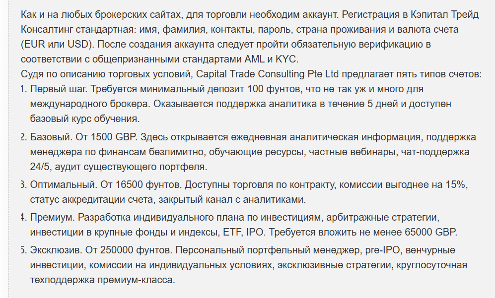 В сети нет данных о том, какими платежными способами можно было пополнить баланс у брокера, но известно, что на выбор предлагали два валютных счета в долларах или евро, а для торговли нужно было пройти верификацию. Также есть информация о пяти тарифах на Capital Trade Consulting, где цена указана в фунтах: