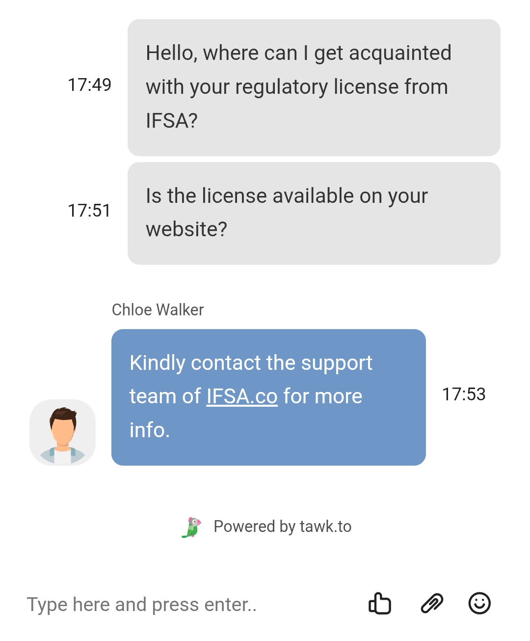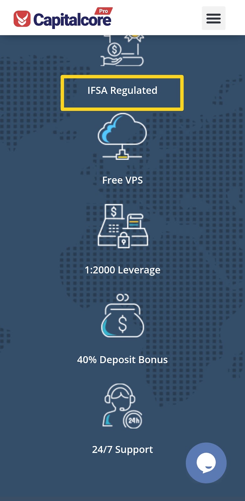 На сайте упоминают регулятора IFSA, но официального подтверждения этому нет. Поддержка доступна по адресу info@CapitalCore com и через встроенный чат на сайте. Мы обратились в последний, чтобы получить ссылку на лицензию.В итоге мы получили от поддержки краткий ответ: «обратитесь к команде поддержки IFSA co за дополнительной информацией. Сайт регулятора, в свою очередь, функции проверки лицензии не имеет, а в поддержке нам просто не ответили. Выходит, если случится блокировка счета или обман, защищать свои права придется одному.