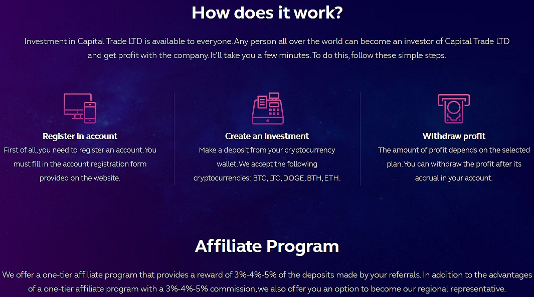 Схема работы с конторой примитивна и явно рассчитана на впечатлительных лиц. Например, она предполагала передачу биткоина и эфира в обмен на эфемерный доход, а всего брокер CapitalTradeLtd поддерживал прием 5 типов самых ликвидных валют.