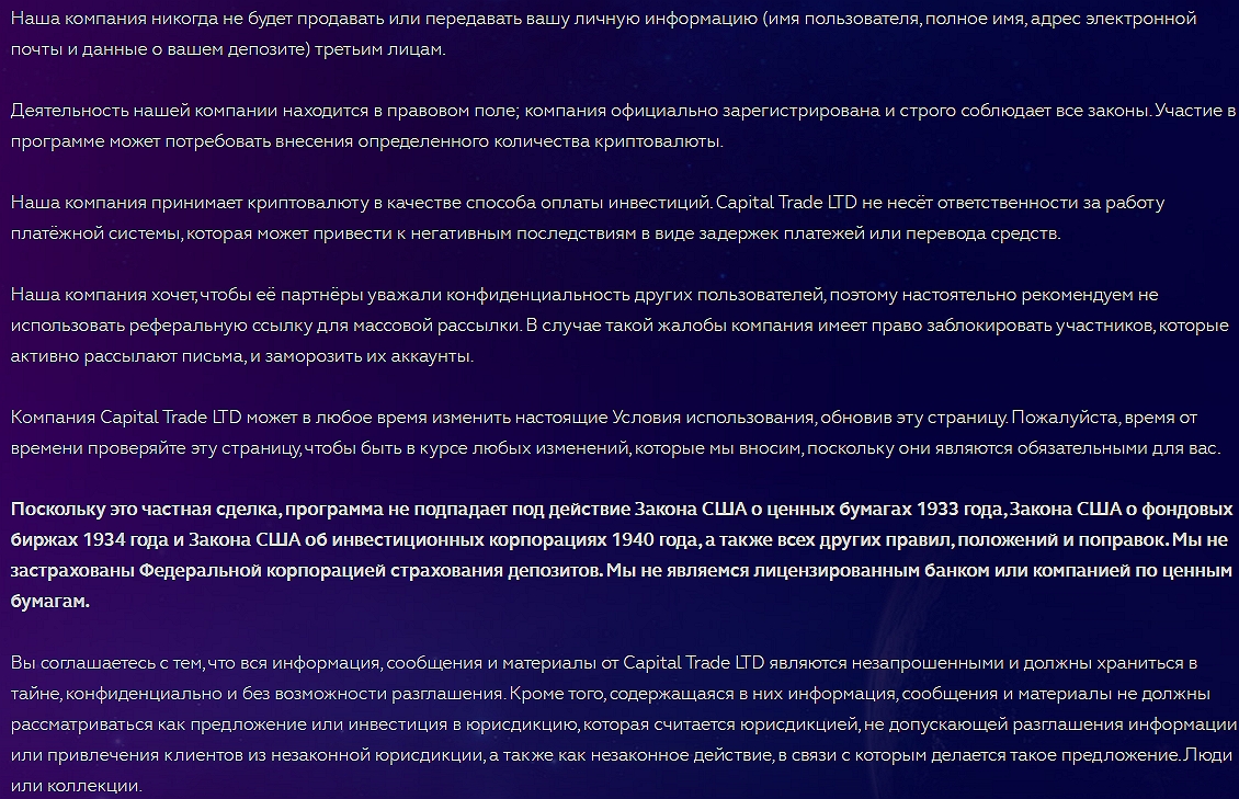 Техподдержка сайта CapitalTradeLtd com не забывала просить деньги, но отказалась от любой ответственности и не желала регулироваться в правовом поле. Хотя ноунеймы и пишут о лицензиях, найти сведения по ним не удалось, а выводить прибыль при этом может быть сложно или вовсе невозможно.