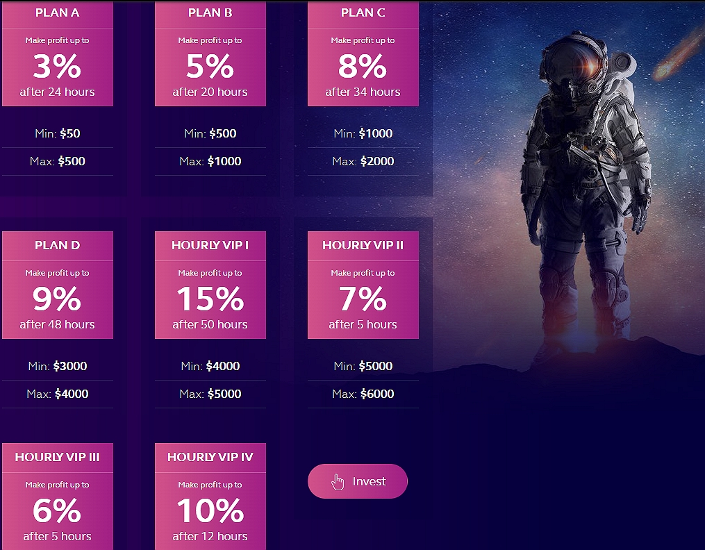 Пополняй платежный счет и зарабатывай — такова идея создателей хайпа, а прибыль те обещали поистине космическую. Так, на тарифе «Plan C» с депозитом в $1,000 ноунеймы якобы планировали наторговать 8% за 34 часа, а $5,000 на «Hourly Vip 2» хотели раскрутить под 7% за 5 часов. Все тарифы диспропорциональны между собой и нелогичны, и такие условия не предложит ни один банк.