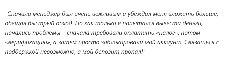 В негативных отзывах люди продолжают писать, что брокерский проект — это обман и скам, что менеджеры занимаются мошенничеством на сайте. Они уверяют, что мошенники выманивают финансы у людей, а потом не дают им вывести их. Клиенты советуют не связываться с биржей, иначе торговля на рынке через нее приведет к убытку финансового состояния.