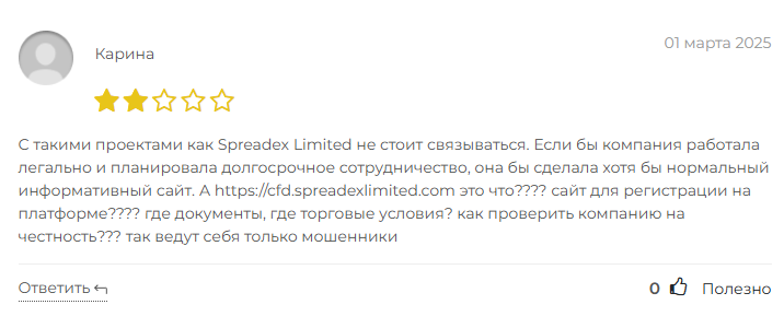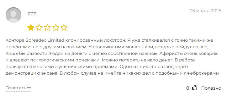 Сайт Спреадекс Лимитед выглядит шаблонно, а в интернете можно найти до 4 похожих доменов и сайтов, которые перенаправляют пользователей на одну торговую платформу. Ни одна надежная биржа не будет создавать зеркала для своего проекта, что создает дополнительные риски при торговле на SpreadEx Limited. Вдобавок на многие их сайты отправлялось много жалоб о фишинге, что подтверждает теорию о мошенничестве.
