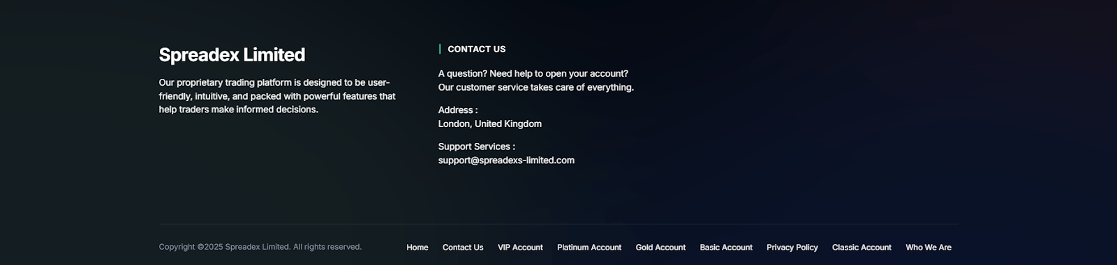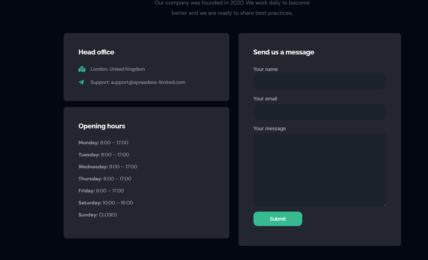 Команда не ведет социальные сети, а единственный способ связаться с командой, это почтовый адрес Support Spreadex Ltd com. Это показывает сомнительное отношение к своим клиентам и ставит под сомнение все заявления о надежной службе поддержки. Нет онлайн чатов для пользователей и ботов в телеграм, где можно было бы оставить жалобу / тикет.