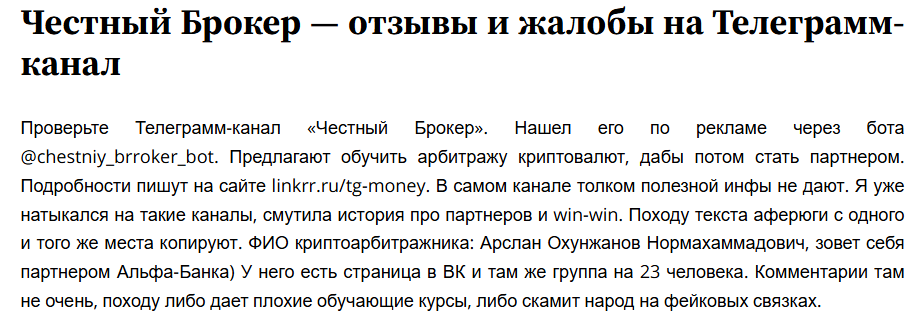 На канале в Telegram Арслан Нормахаммадович Охунжанов заявляет об отсутствии отрицательных отзывов. Их, действительно, нет, как и положительных. Об авантюристе, который позиционирует себя как профессионального брокера, ничего не сказано.