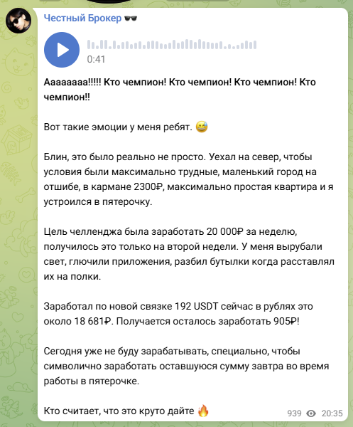 Канал в «Телеграм» «Честный брокер», по обещаниям автора, должен был посвящен теме инвестиций, трейдинга и арбитража криптовалют. Однако большинство постов содержат информацию о личной жизни, челленджах и тому подобном. Об информативности контента можно судить по данным, представленным на скриншоте ниже.