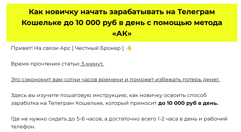 Большинство подписчиков телеграмм-канала приходит на него с бота с ником Chestniy brroker bot. Основным предложением является арбитраж криптовалют. Автор проекта обещает 10 тысяч рублей пассивного дохода в качестве заработка на криптовалютном кошельке в Telegram.