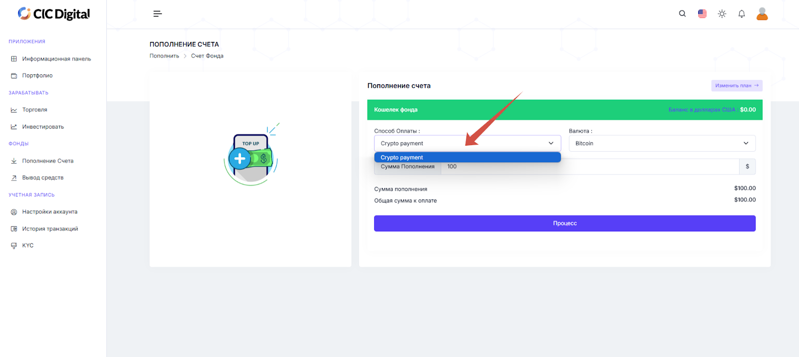 По вводу и выводу капитала никаких данных не найдено. Вся предложенная информация по работе на платформе изложена общими фразами. Для начала сотрудничества юзер должен пройти процесс регистрации. Мы вошли в систему и решили сделать депозит. Для ввода средств доступен только платеж в криптовалюте. Следует обратить внимание, что такой способ пополнения, как правило, используют мошеннические организации.