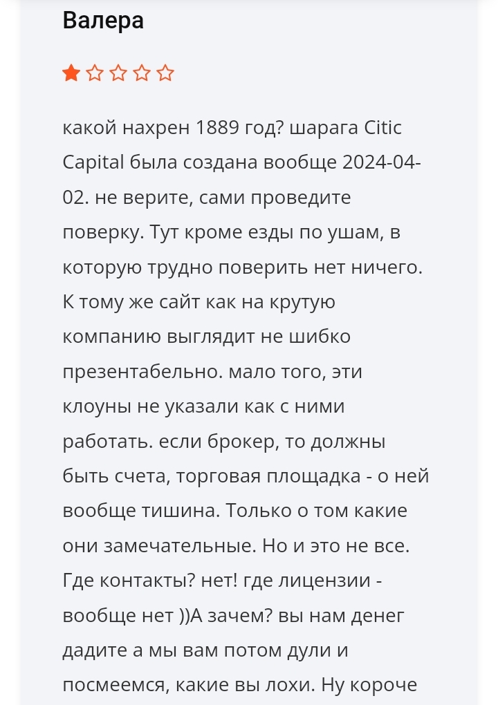 Рассмотрев всю доступную информацию, мы не нашли ни одного факта, говорящего о возможности заработать с брокером citic capital. Мы советуем читателям держаться от этих мошенников подальше. Любое сотрудничество с брокером однозначно приведет к убыткам.