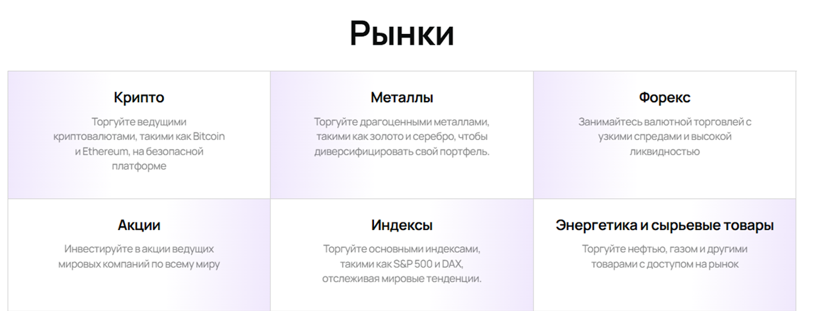 На сайте «Смс капитал брокер» детального описания всех торговых условий нет. Коротко дается расшифровка каждого из видов рынков, с которыми работает брокер. Это акции, Форекс, энергетические товары, металлы, криптовалюта и индексы.