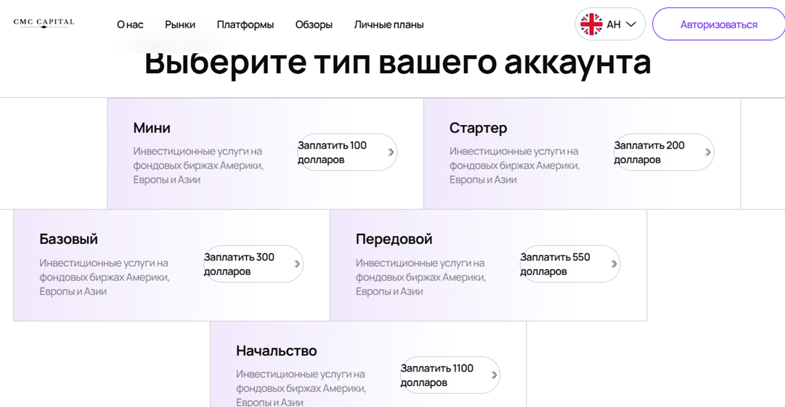Трейдерам предложено 5 тарифных планов – мини, стартовый, базовый, передовой и профессиональный. Но детального описания каждого из них нет, лишь упоминается стартовый депозит для начала торговли. Минимальная сумма, с которой трейдер может начать торговать – 100 долларов. О размере комиссионных сборов данных нет, как и о способах вывода и пополнения средств.