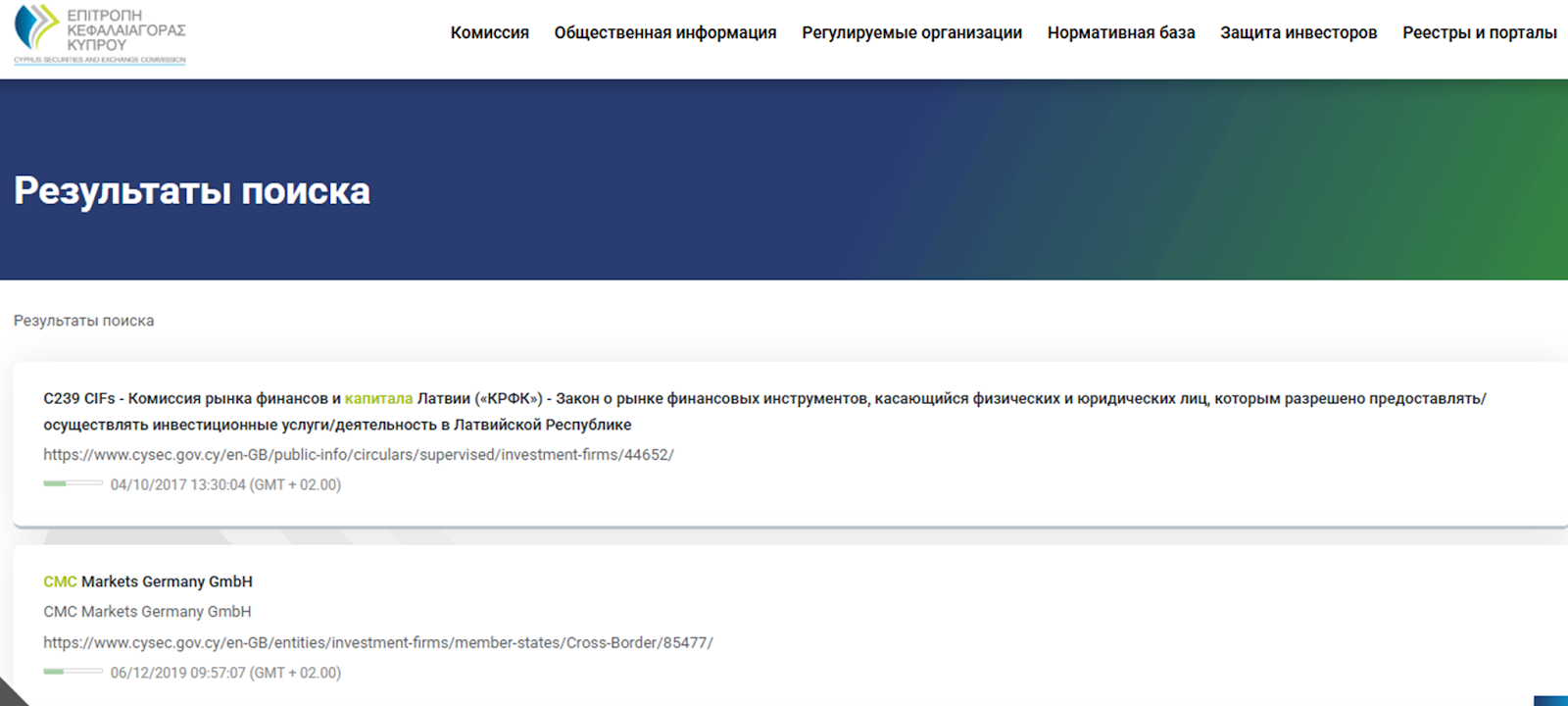 My.cmcapitalltd com – далеко не безопасный брокер. Начнем с того, что информация о лицензии Cysec фейковая. Проверка на сайте регулятора показала, что компании с подобным именем не существует.