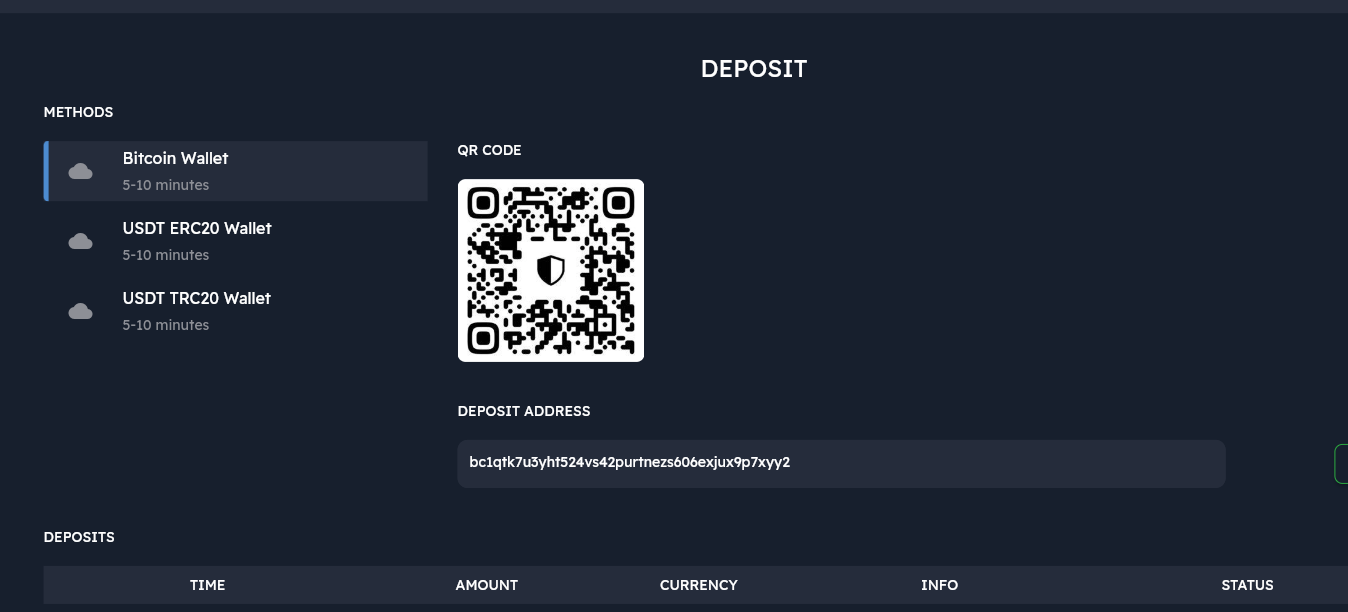 Поддерживается внесение депозита в биткоинах и в стейблкоине USDT через сеть TRC-20 и ERC-20. Пополнить счет в привычных рублях, долларах, евро и другой фиатной валюте нельзя.