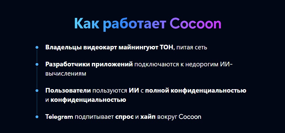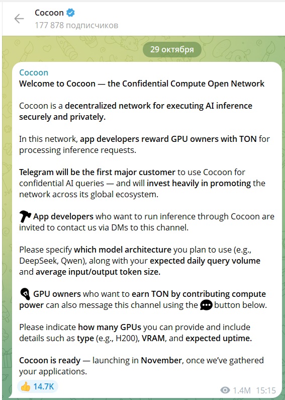 Проект Cocoon — это децентрализованная сеть для приватных вычислений. Публика активно интересовалась, когда старт Cocoon станет реальностью, и получила ответ осенью 2025 года. Он сочетает в себе майнинг криптовалюты TON, искусственный интеллект и блокчейн. Актуальные новости о Cocoon и TON публикуются в официальных каналах проекта, подчёркивая их тесную интеграцию.