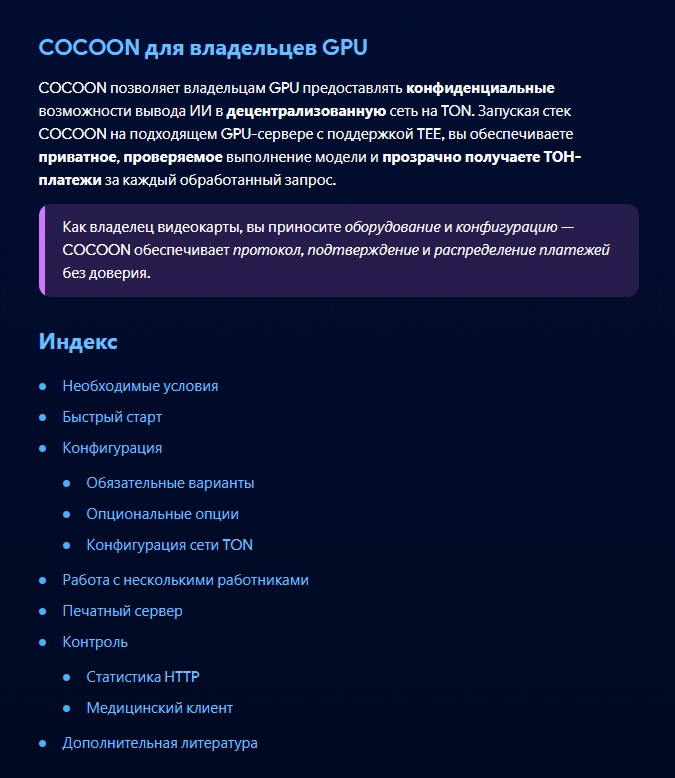Важный практический момент — какие видеокарты поддерживает Cocoon. Согласно документации, необходимы современные GPU NVIDIA с поддержкой конфиденциальных вычислений. Затем нужно отредактировать конфигурационный файл, указав данные своего TON-кошелька, параметры GPU и другие настройки.