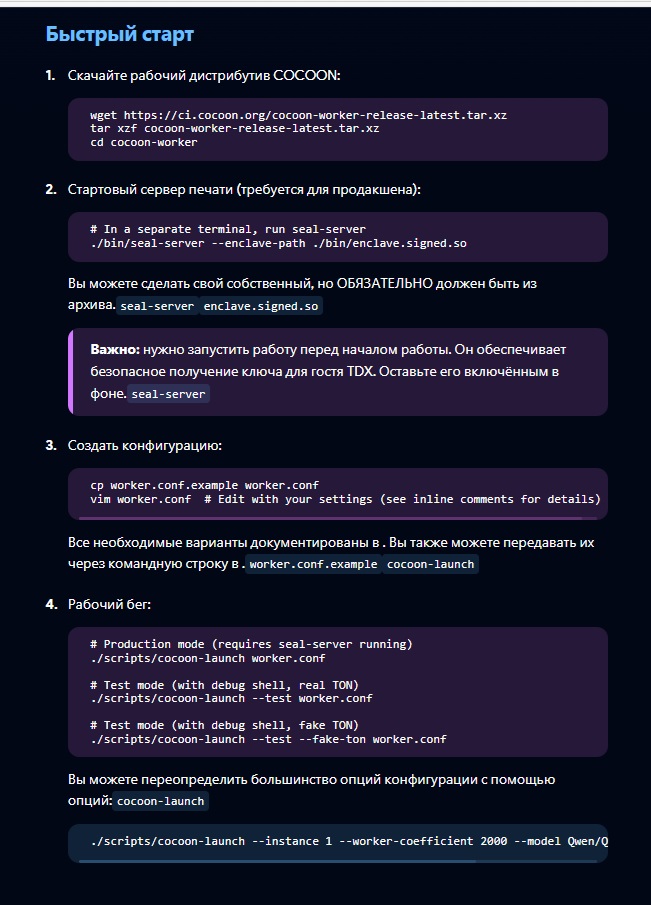 Далее встаёт вопрос, как настроить майнинг в Cocoon. Процесс требует выполнения ряда технических шагов. Сначала необходимо скачать рабочий дистрибутив с официального источника и подготовить сервер с поддержкой специфичных технологий безопасности, таких как Intel TDX.