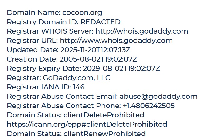 Проверка домена через WHOIS показывает интересный факт. Домен cocoon.org был зарегистрирован еще в 2005 году. Это говорит о том, что для проекта был выбран или приобретен существующий, «возрастной» домен, что может использоваться для повышения видимого доверия. Сам проект, однако, был анонсирован лишь осенью 2025 года, что указывает на его фактическую новизну, несмотря на «старый» адрес сайта.